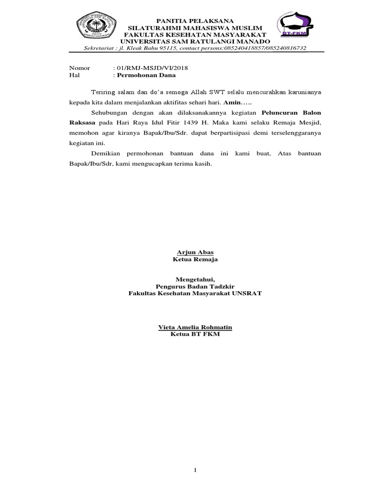 Demikian proposal pengajuan bantuan dana ini kami sampaikan, sudilah kiranya bapak untuk dapat memperhatikan serta kami sampaikan banyak terima kasih. Contoh surat permohonan dana kegiatan himpunan mahasiswa jurusan kepada kajur, berikut ini adalah contoh tentang contoh surat permohonan da. Permohonan dana raya 2016 terengganu online. Proposal permohonan dana masjid atau musholla, umumnya diperlukan saat lingkungan sobat hendak membuat mesjid atau musholla baru. Semua contoh suratnya sudah menggunakan bahasa indonesia yang baik dan.